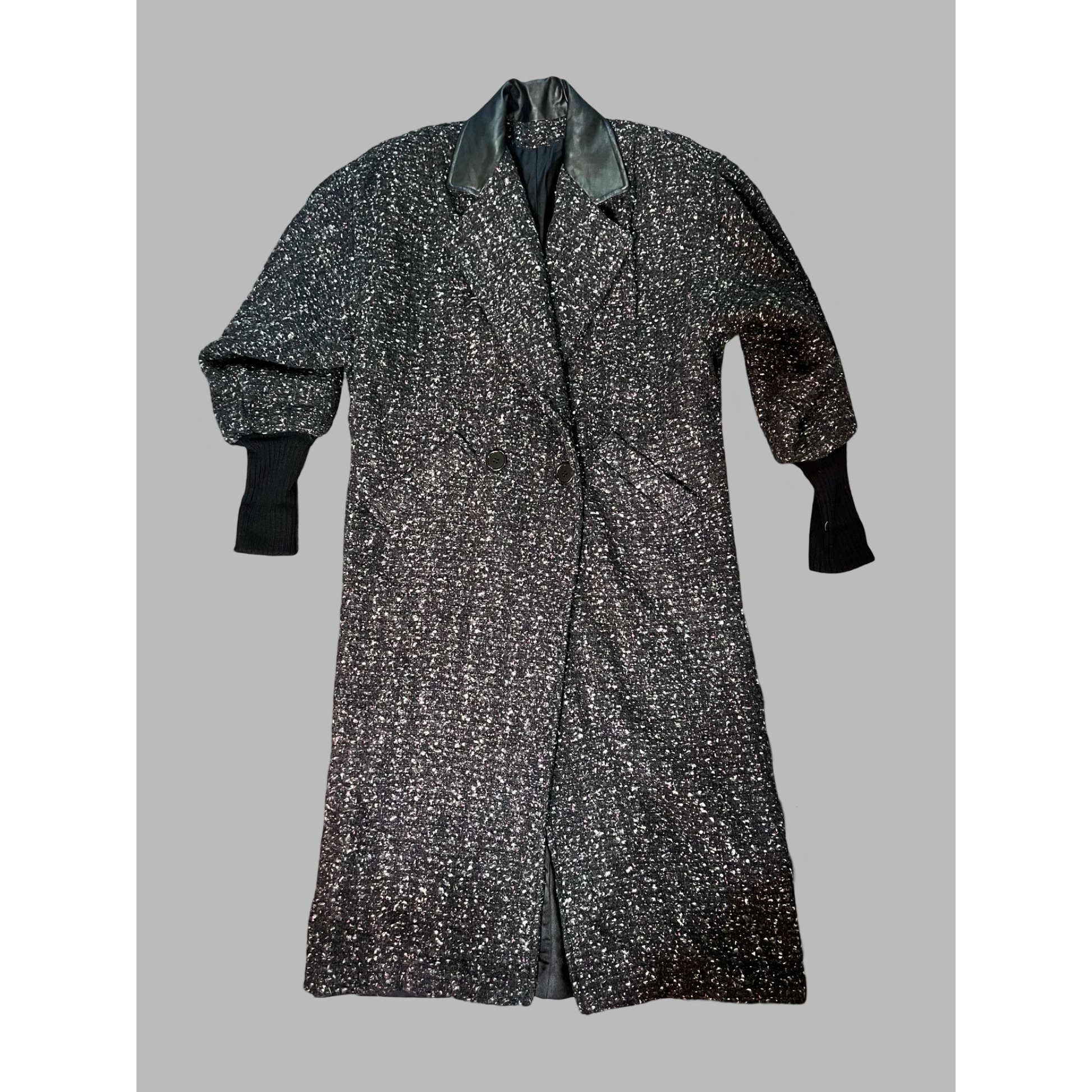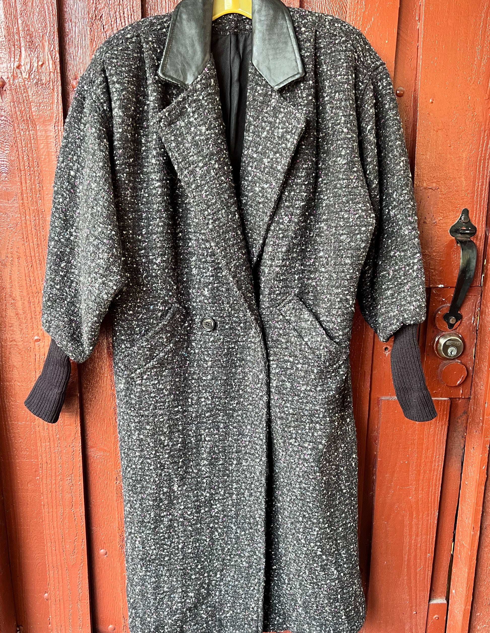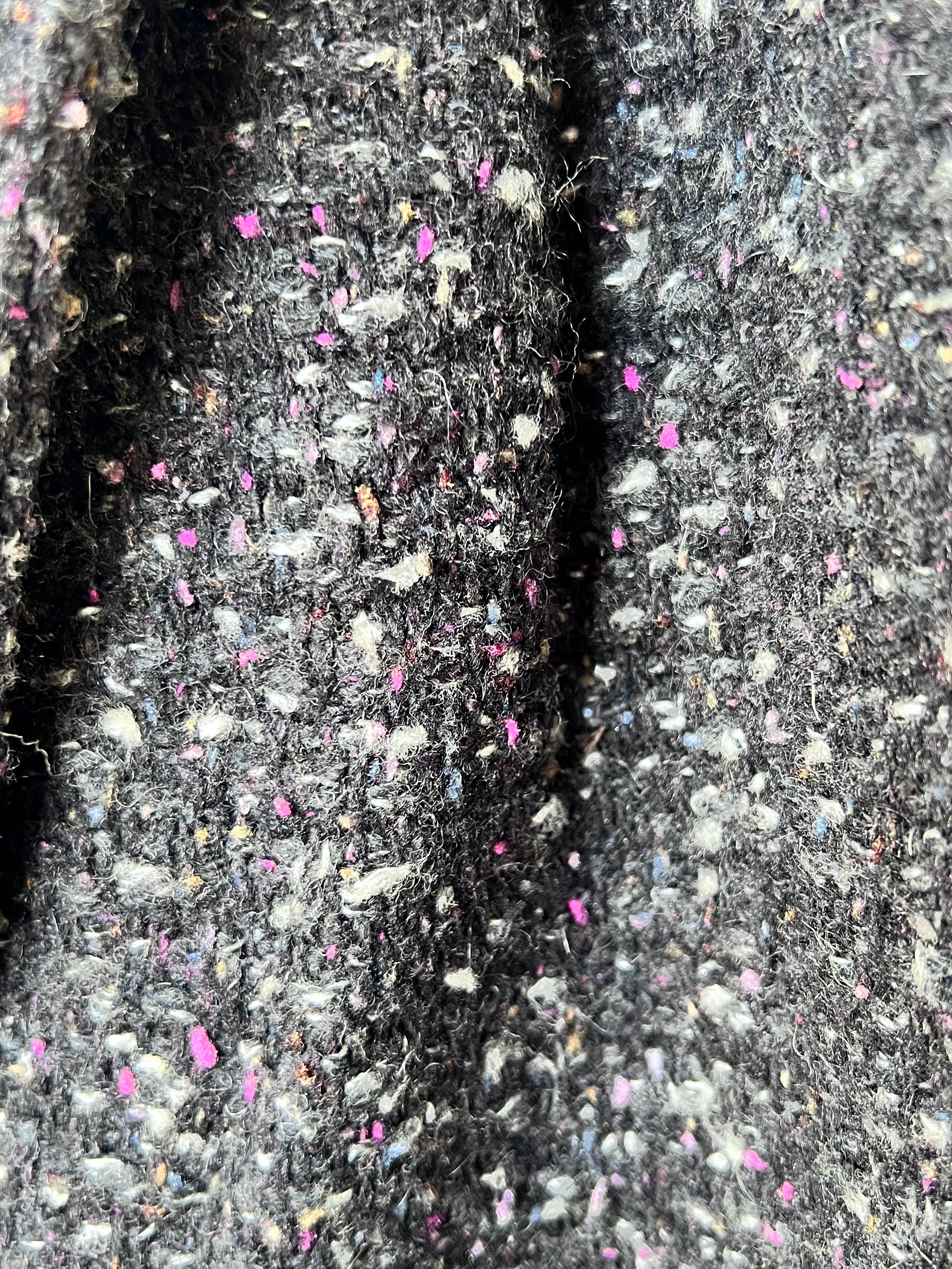 Boucle woven yarn with many fun colors can be seen in the weave. Black , gray , pink , white , taupe and blue . This is a full length , double breasted coat , full satin poly lined with a black leather collar . The cuffs are ribbed knit like the top of socks and can be folded for a shorter cuff .