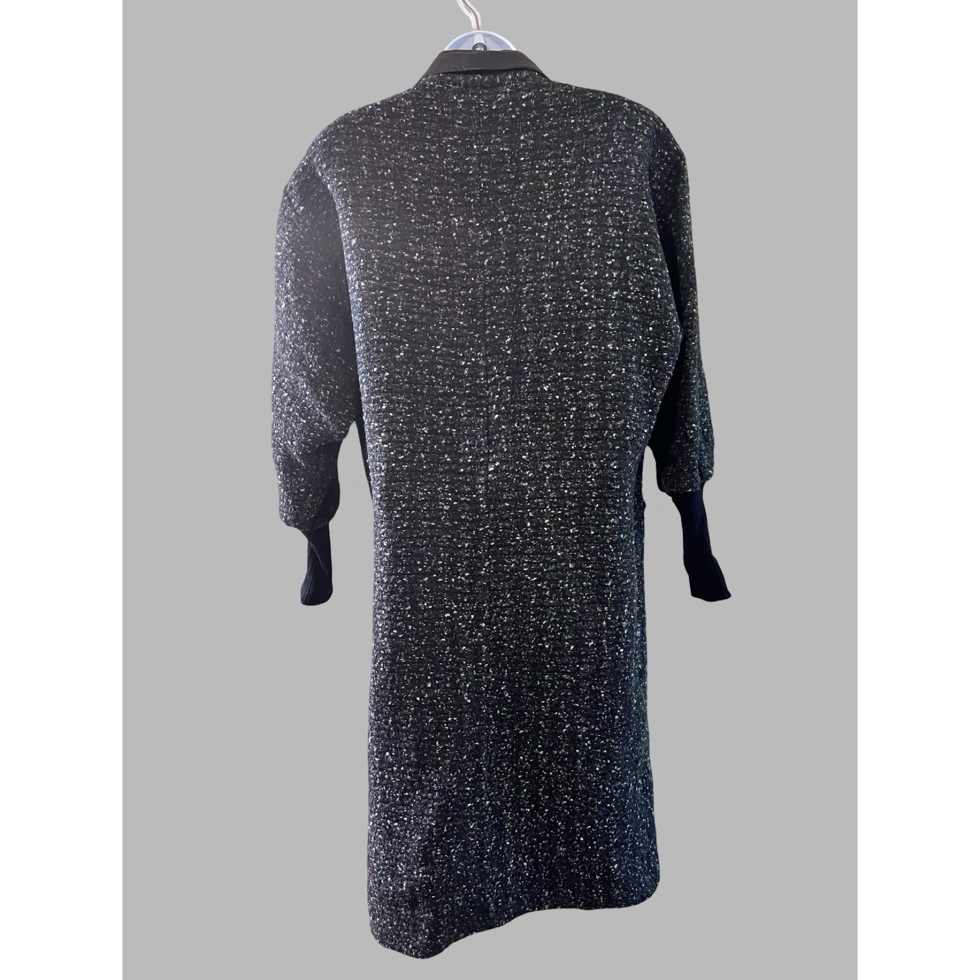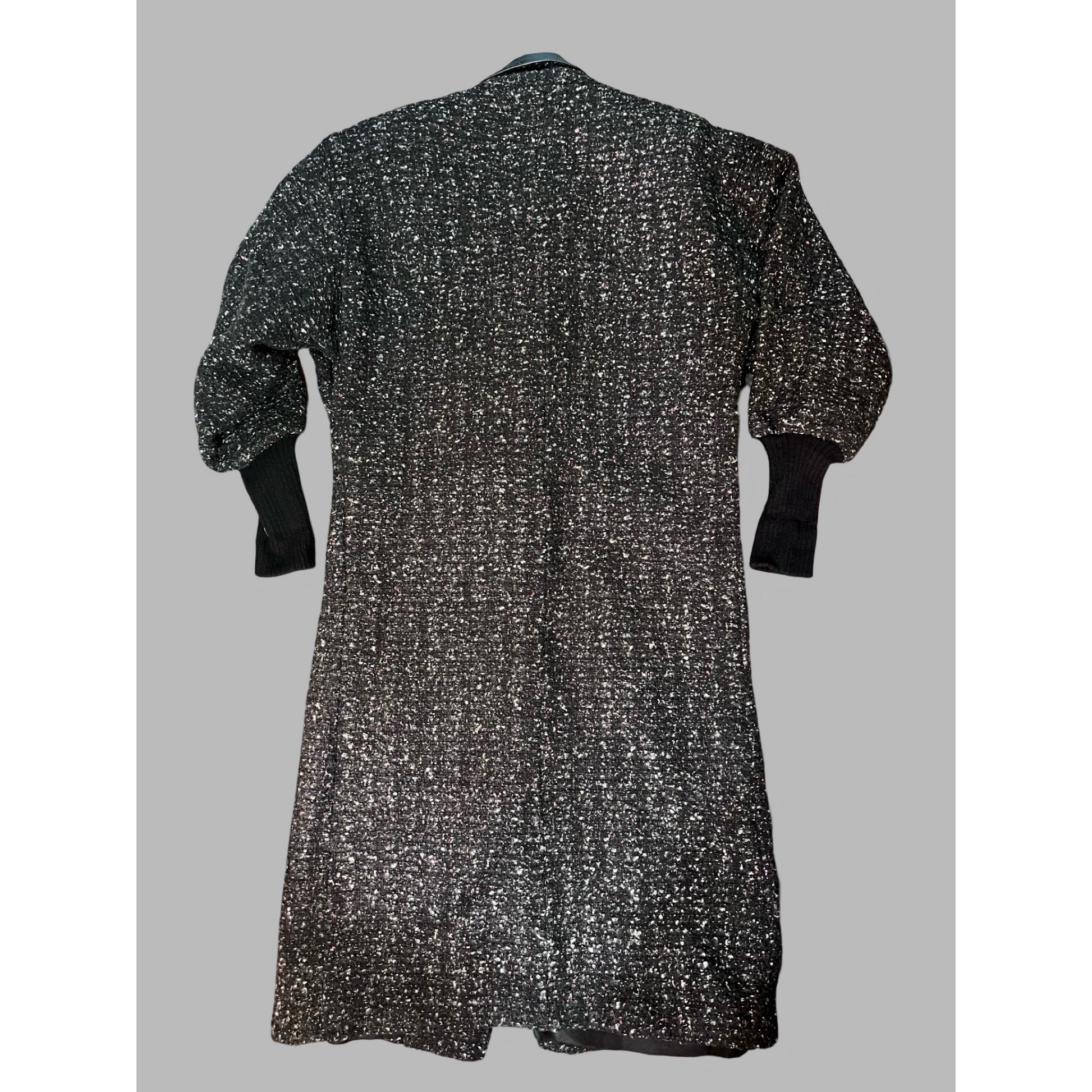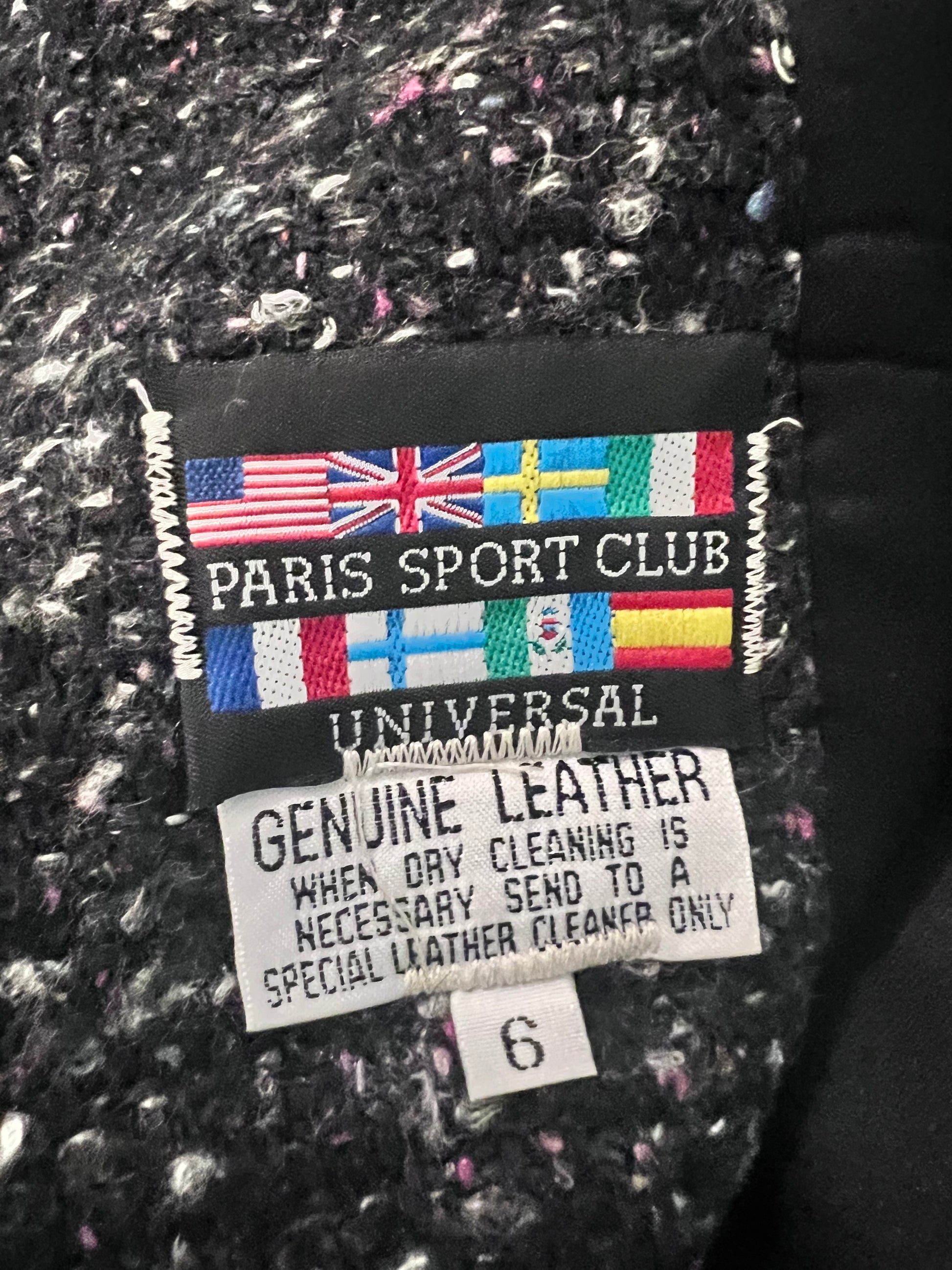 Boucle woven yarn with many fun colors can be seen in the weave. Black , gray , pink , white , taupe and blue . This is a full length , double breasted coat , full satin poly lined with a black leather collar . The cuffs are ribbed knit like the top of socks and can be folded for a shorter cuff .